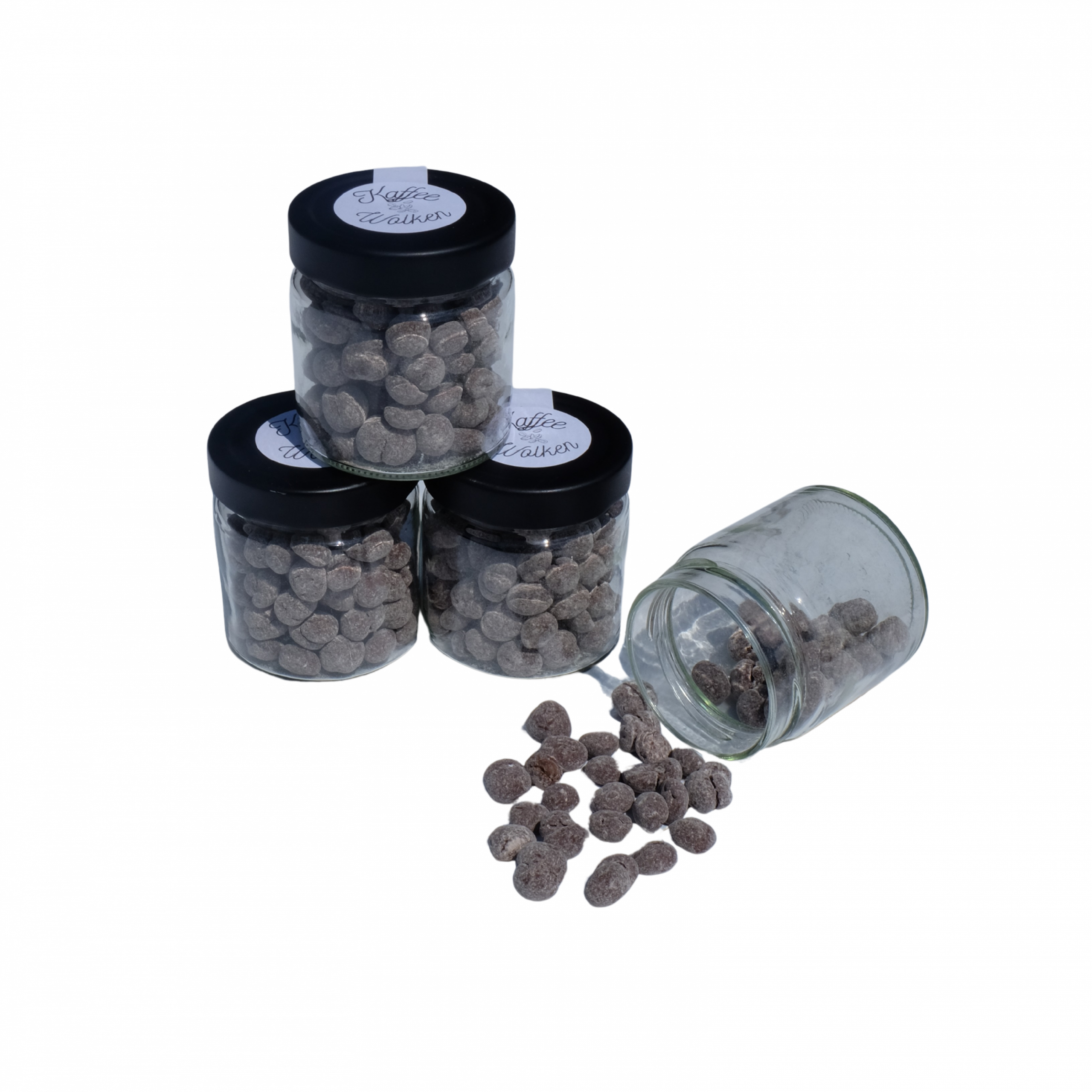 Geröstete Kaffeebohnen, von dunkler Schokolade umhüllt